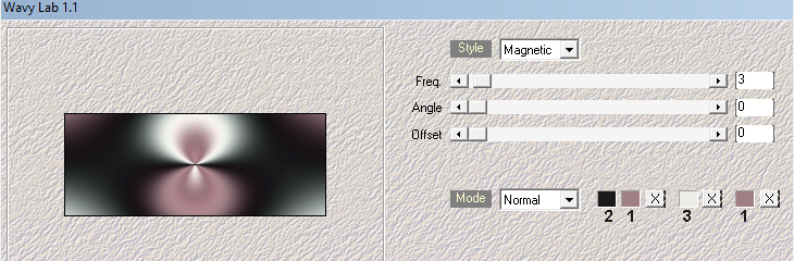 1. Öffne deine Tube in PSP. Suche Dir eine mittlere Vordergrund- und eine dunkle Hintergrundfarbe. 2. Öffne ein neues Bild - 900 x 550 Pixel - Transparent Effekte - Plugins - Mehdi - Wavy Lab 1.1 Ich habe eine dritte Farbe aus meiner Tube ausgesucht (Nr. 3), du kannst hier aber auch weiß nehmen